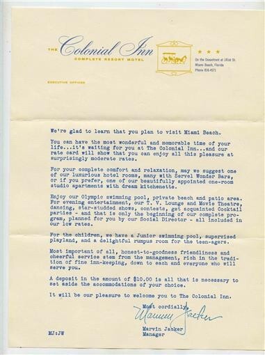 Colonial Inn Information Letter 1957 Ocean at 181st Street Miami Beach FL