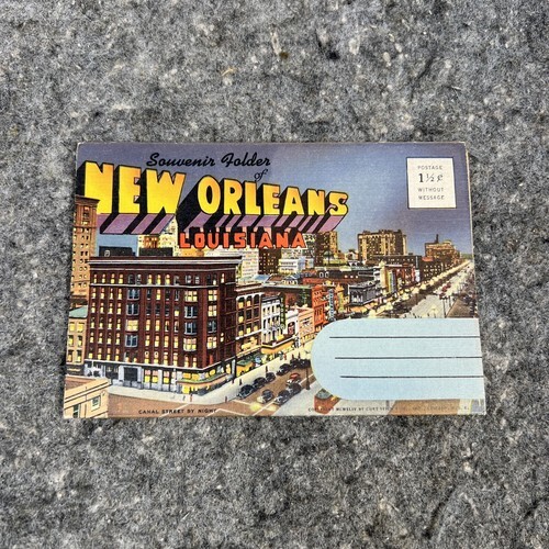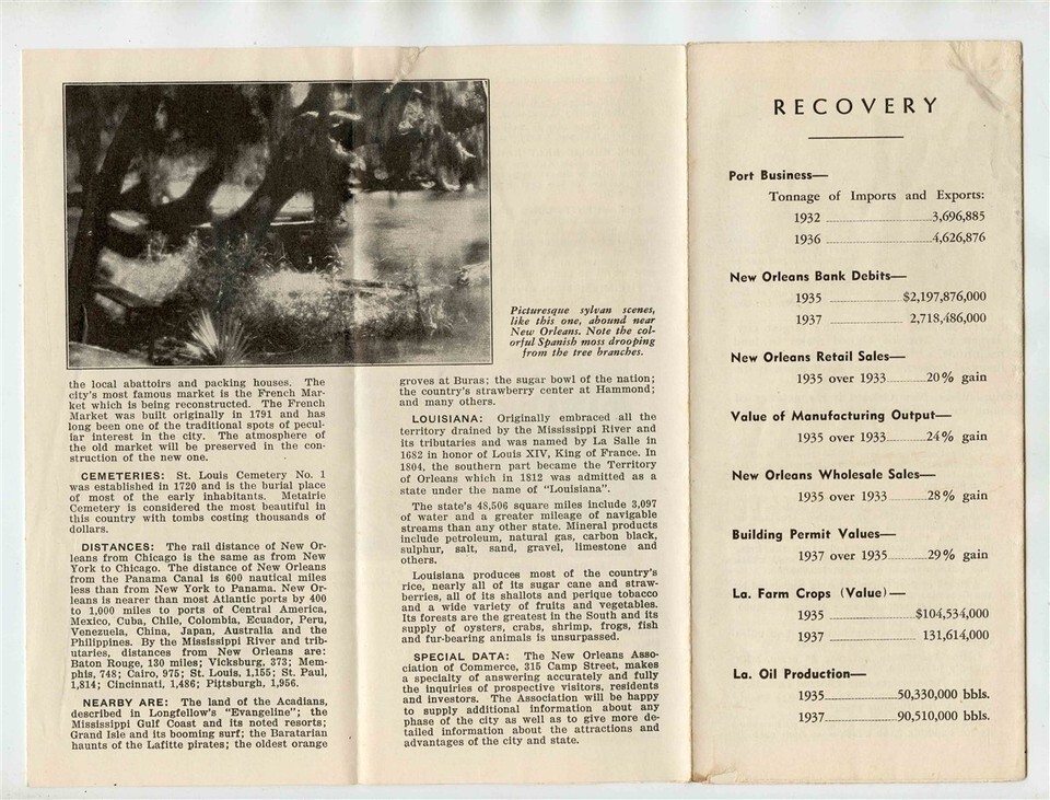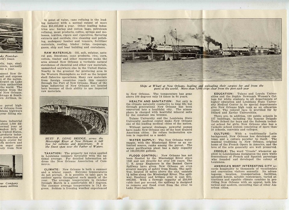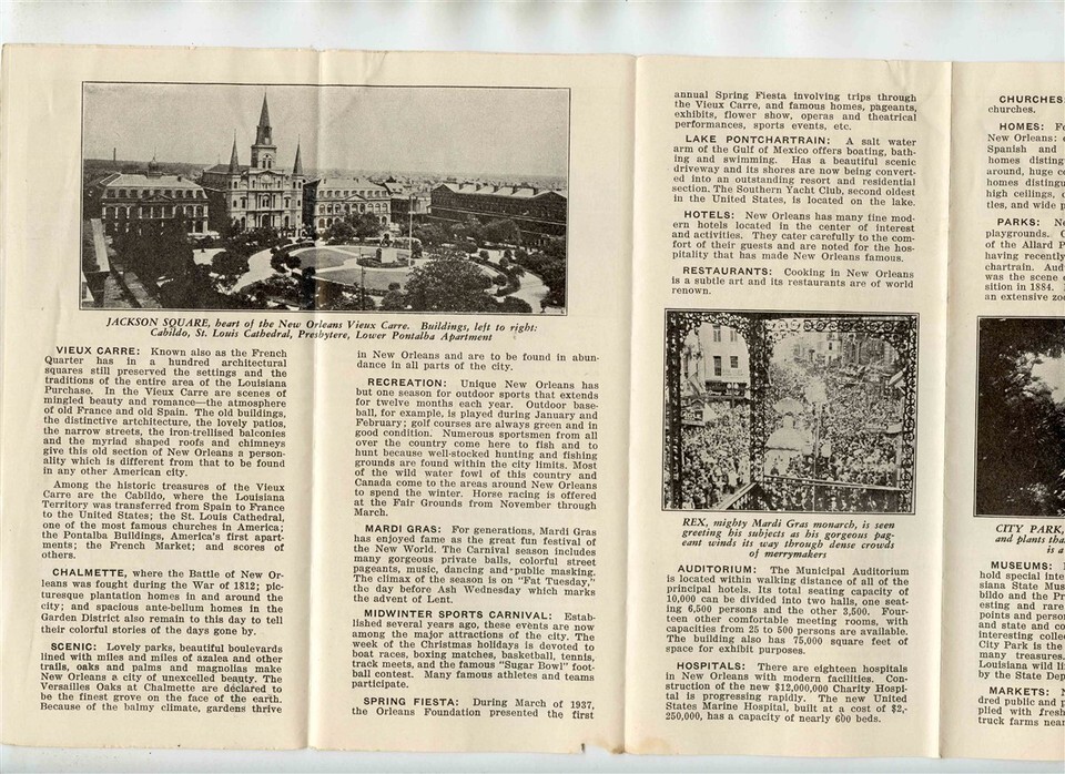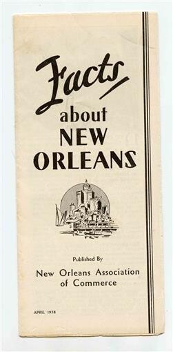 A well illustrated 16 panel fold out brochure. Facts About New Orleans Brochure. Published in April 1938 by the New Orleans Association of Commerce, With photos, facts, history and much more.
