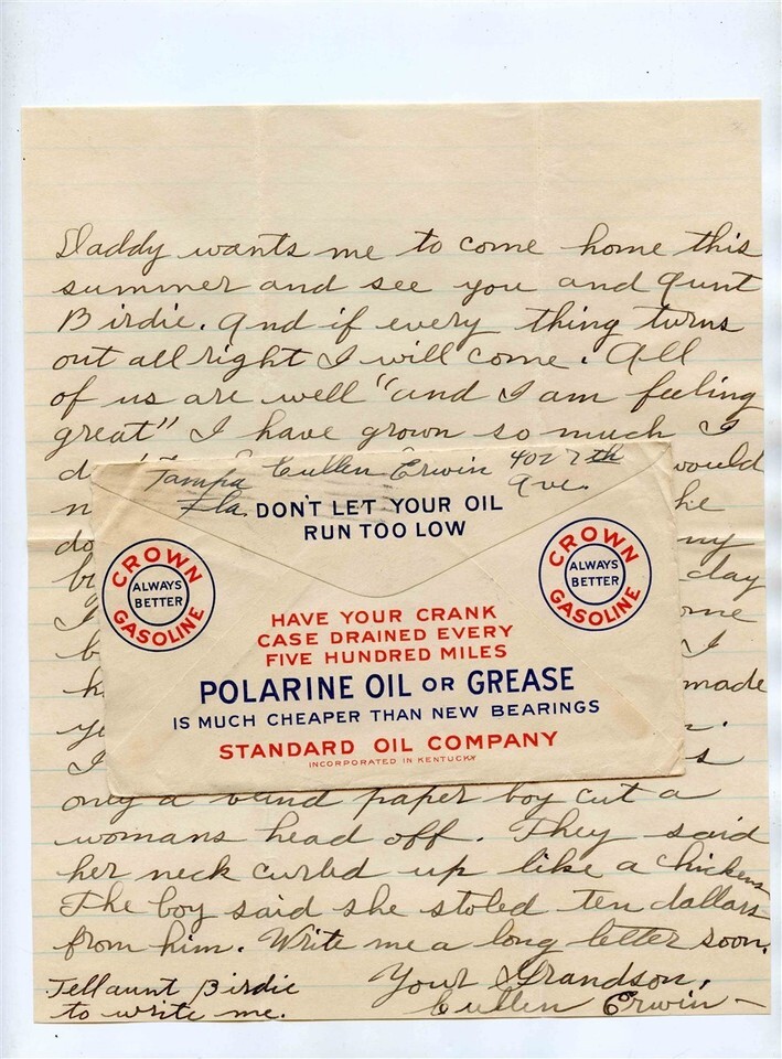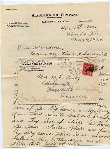 A 2 page personal letter , with the first page dated May 9, 1926 and written on Standard Oil Company of Jacksonville Florida letterhead and the second page on lined paper. Includes the interesting 2 side Standard Oil and Crown Gasoline envelope. Mailed from Tampa.