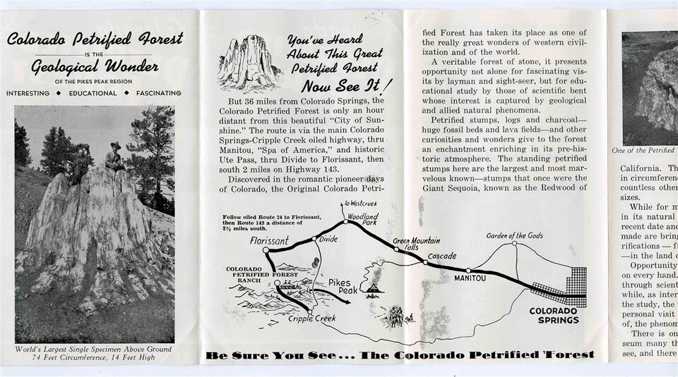 An 8 panel fold out brochure with photos, area map, history, visitor information and more. Colorado Petrified Forest Brochure. Circa 1930's. Interesting, Educational Fascinating