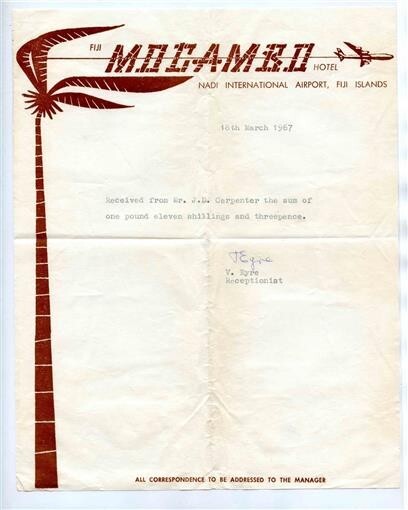 A single page letterhead with receipt of payment in 1967. Mocambo Hotel Letter , located at Nadi International Airport Fiji Islands 1967