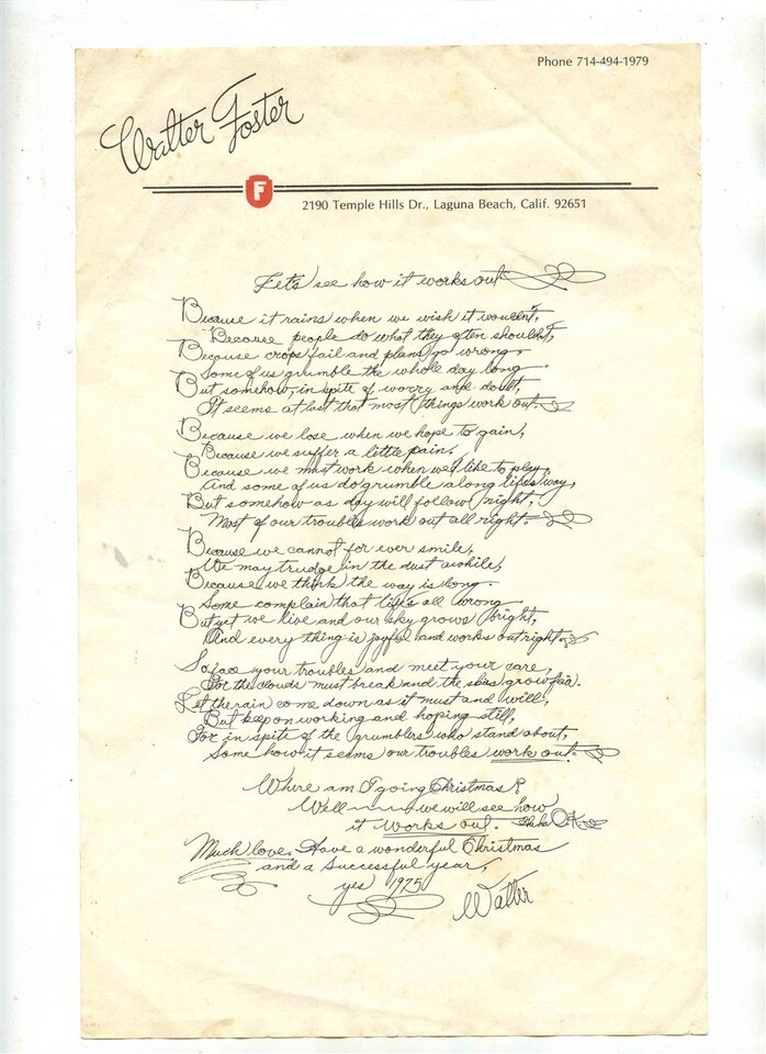There are 2 pages of Christmas letter and poem, facsimile signed on the stationery of Walter Foster. Walter Thomas Foster (1891?1981) was an American entrepreneur, artist, art instructor, writer, editor and publisher. The Walter Foster Publishing Company's line of low-cost art manuals were widely distributed to art stores, often displayed in a metal rack specially made for Foster's oversized art books.