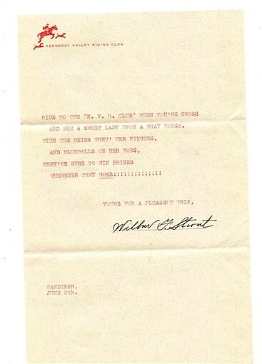 A single page letter with original envelope. Kennebec Valley Riding Club Gardiner Maine Letter Envelope. Dated 1937