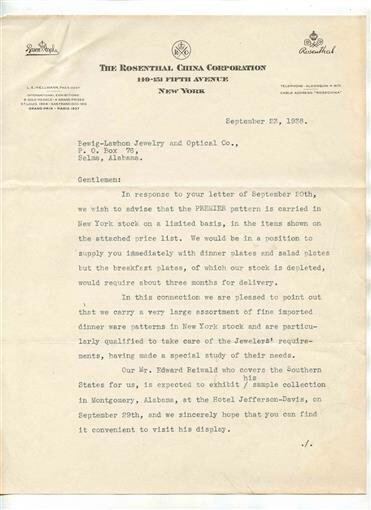 Rosenthal China Corp. Letterhead 5th Avenue New York 1938