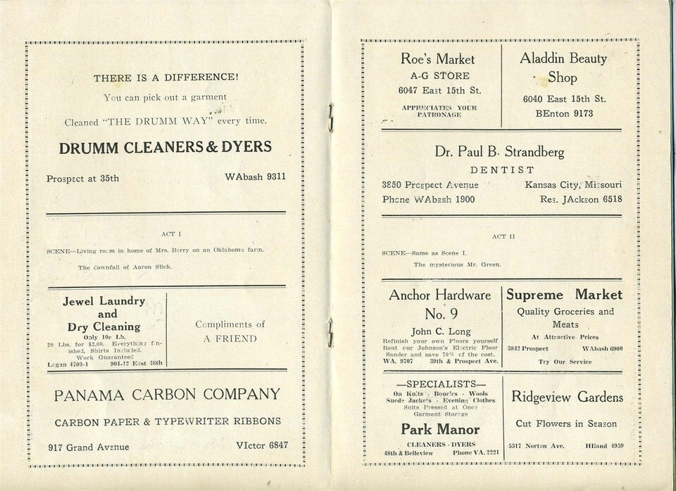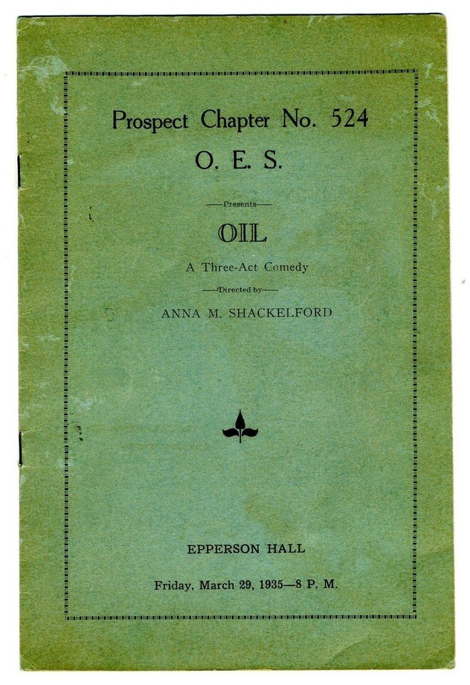 An 8 page program from a production of OIL, a 3 Act Comedy by the Prospect Chapter 524 on the Order Eastern Star in Kansas City. From a performance on March 29, 1039 at Epperson Hall. With performance information, actors, local advertisements and more. In very good condition with paper aging