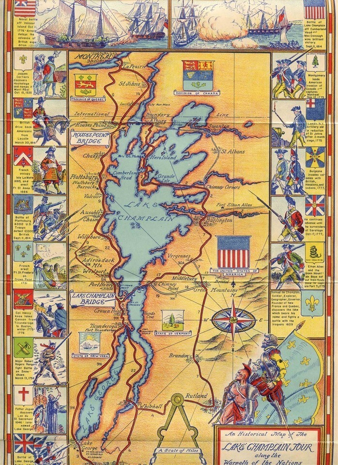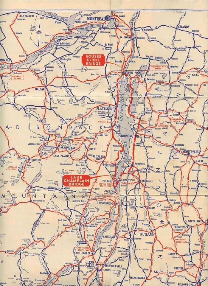 A 16 panel fold out brochure with amazing War Path of the Nations Map . Lake Champlain Bridges Brochure and Official Map Has New York to Montreal Strip Map, information, Distances Chart and toll rates and full color Lake Champlain historical tour amp on one side and large area map on the other side, Circa late 1930's
