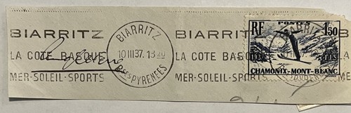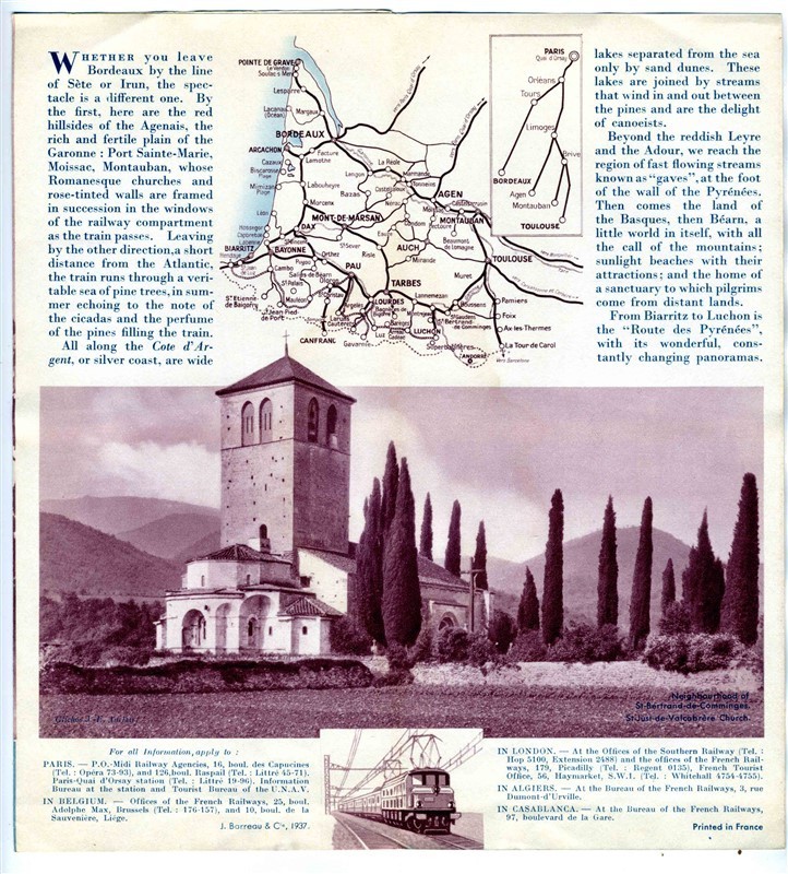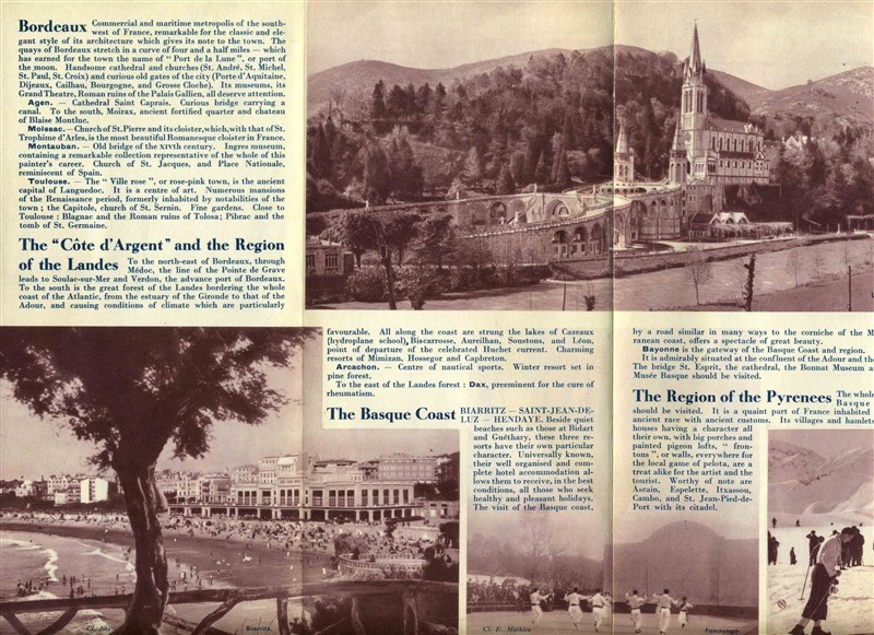 An 8 panel fold out brochure in English with many photos, map and information on Bordeaux, The Cote d'Argent and the Region of the Landes, The Basque Coast, The Region of the Pyrenees and more. A From the Garonne to the Pyrenees Brochure, Dated 1937 on this area of Southwestern France.