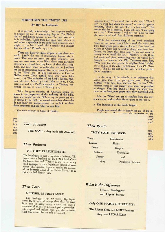 There are 2 different 4 page brochures used in the 1948 Kansas elections on the legalization of Liquor Stores These are Kansas Prohibition Vote No Brochures published by the Kansas United Dry Forces. Kansas has the strictest liquor laws in the United States and has still not ratified the 21st Amendment which ended nationwide prohibition in 1933. Includes The Liquor Stores and Bootleggers and Scriptures the West Use.