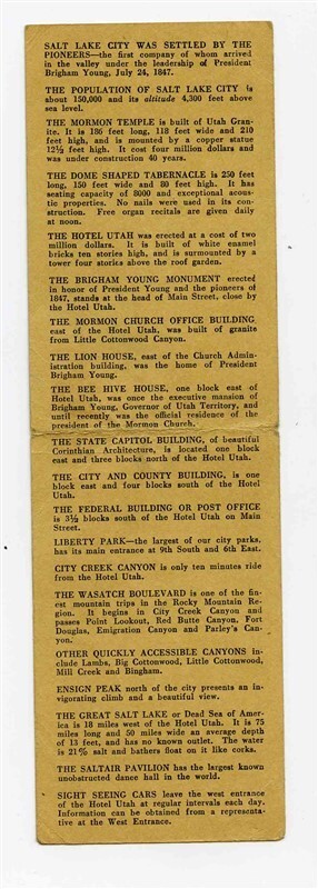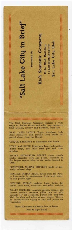 A packet sized 4 panel brochure. Salt Lake City in Brief Brochure by the Utah Souvenir Company in the 1930's. Measures about 3 7/8" x 2 3/8" when closed.