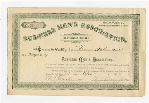 A single page numbered certificate. Business Men's Association of Evansville Indiana Member Certificate, dated April 10, 1888. Measures about 9 1/2" x 6 1/8" and the back is blank. Has an embossed seal.