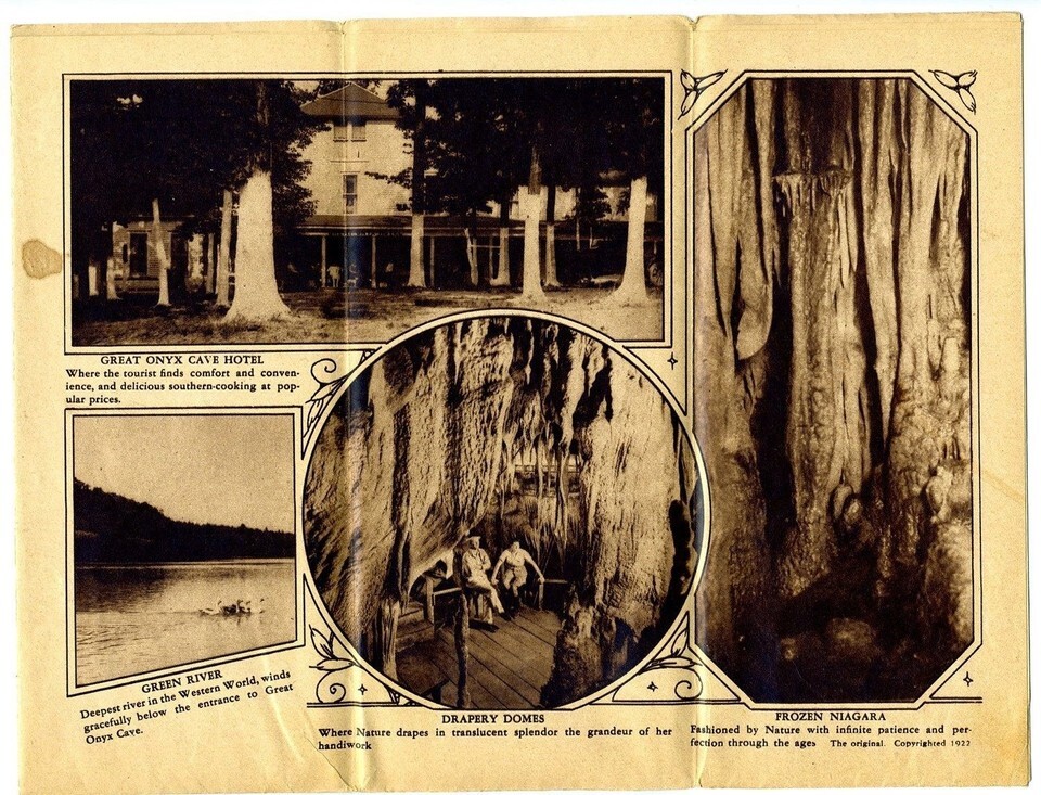 Opens to about 21 1/2" x 16 1/2" and is filled with sepia tone photos of the Great Onyx Caves, Hotel and Area. In fine condition. With area map and Cave information. Circa 1930's. Located in the Cave Region of Kentucky.
