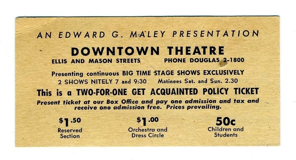 Edward G Maley Downtown Theatre 1950's San Francisco 2 for 1 Special Ticket