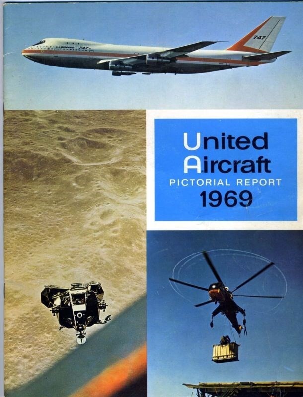 A well illustrated 32 page United Aircraft Pictorial Report 1969. with photos and information on the Products, Research, and Interests of United Aircraft. Lots of photos and information on Military and Commercial Aircraft, Helicopters, Space Craft and more.