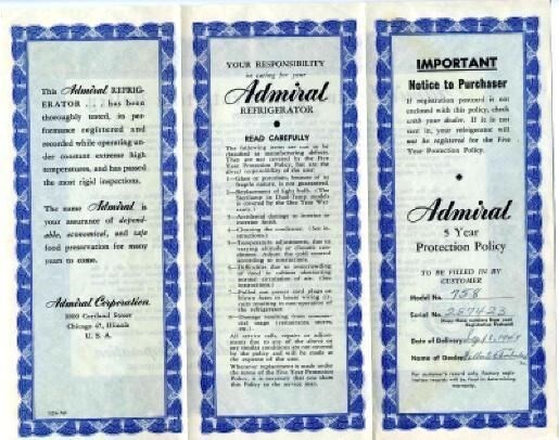 Admiral Electric Refrigerator Warranty and 50 similar items