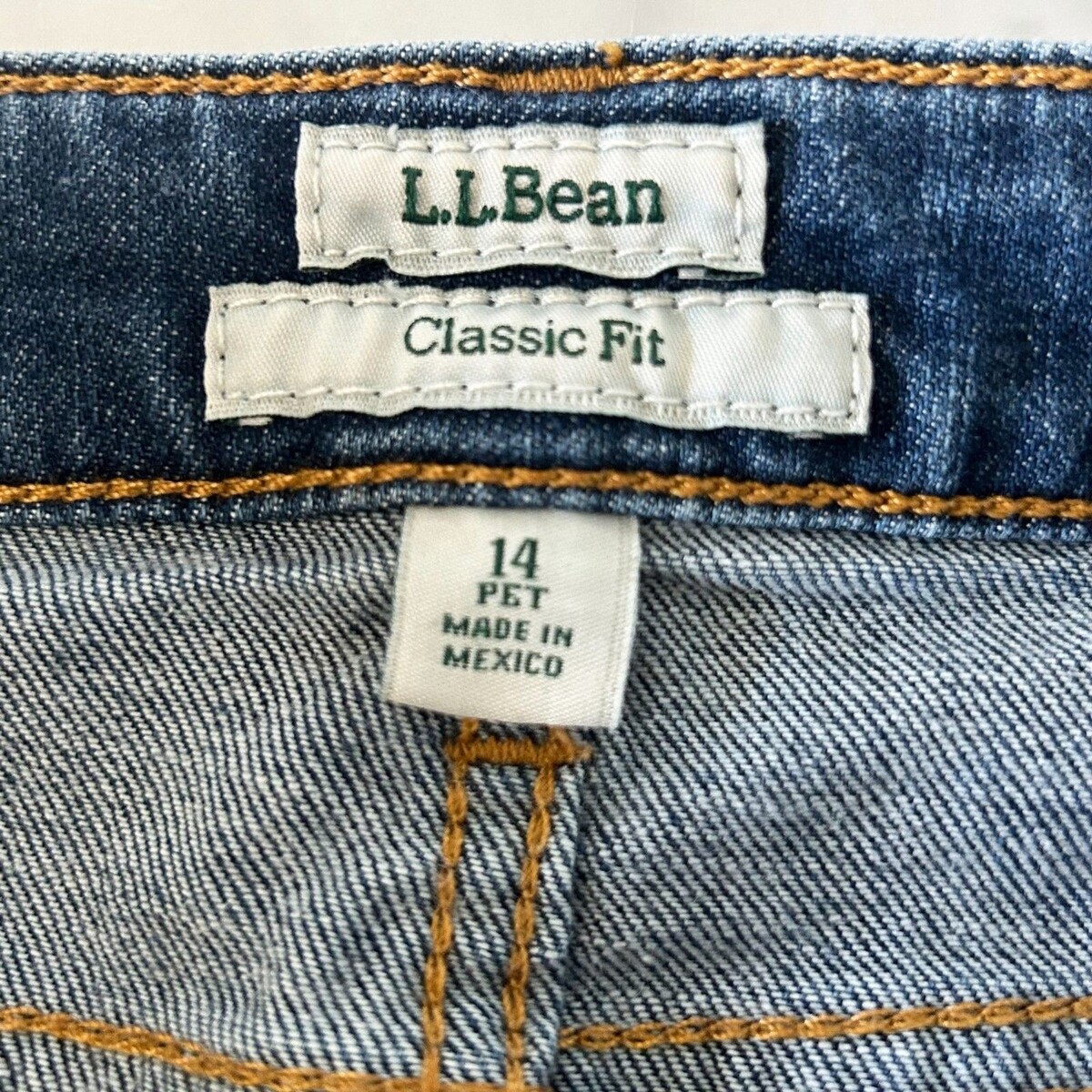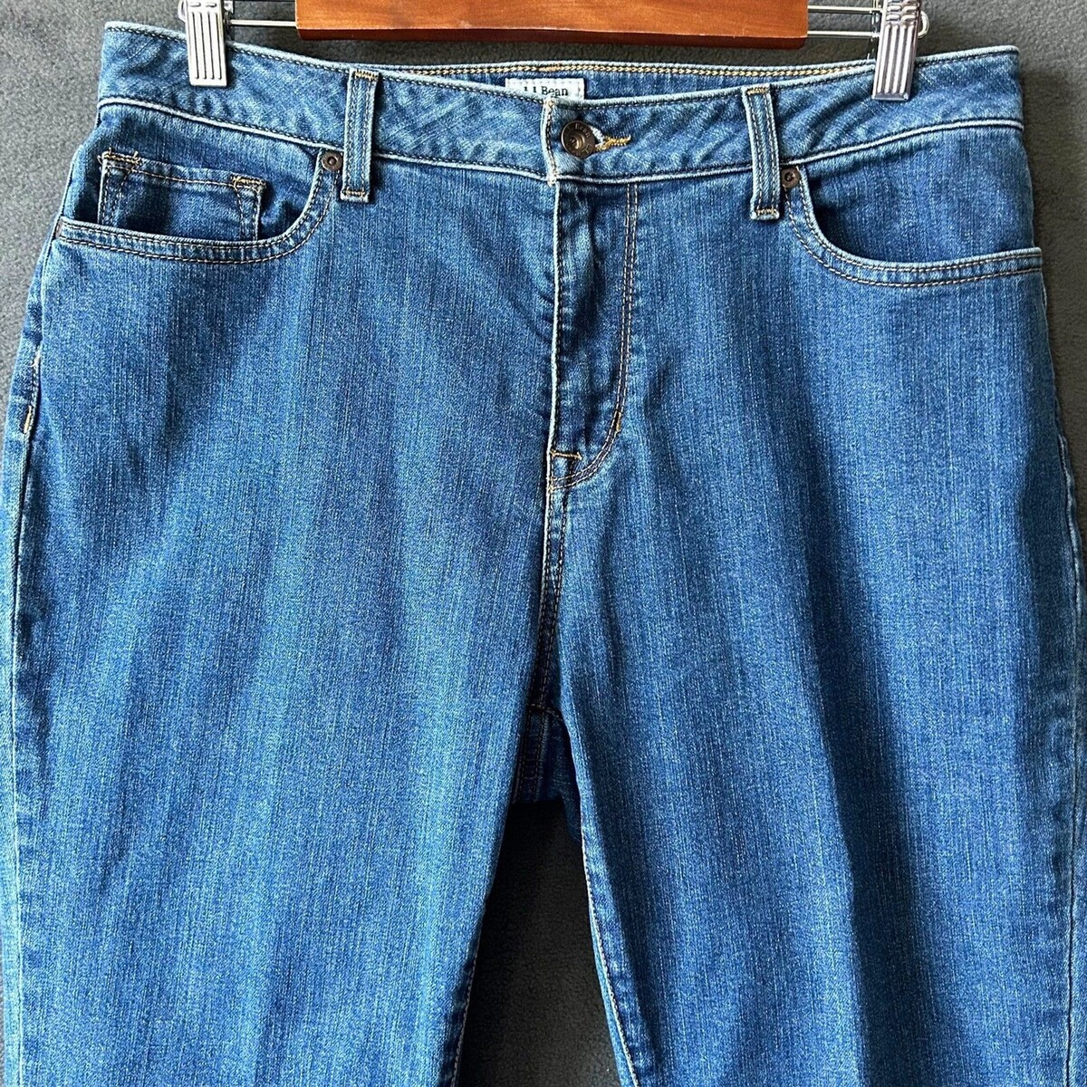 LL Bean blue denim jeans women's size 14 Petite. Classic fit, medium wash, zip front, single button, five pockets, straight leg. 93% Cotton, 5% Polyester, 2% Elastane; machine wash. Excellent condition.