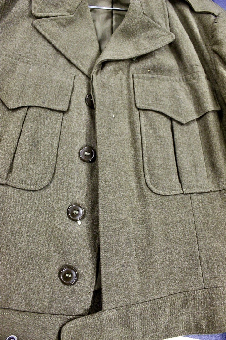 Vintage Retro WW2 Army Green "Ike" style Eisenhower jacket with buckle sides and patches. It does have some moth damage as shown but overall great shape. Herman D. Oritzky Co Label
