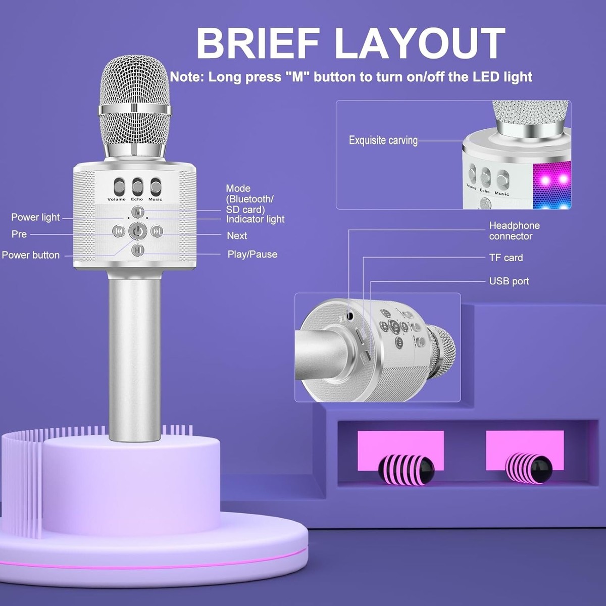 ?Controllable Dynamic LED Light?? Music~ 27 colorful LED lights will flicker with the rhythm of the music. Higher volume, brighter light, perfectly creating a karaoke atmosphere for you. If long pressing "M", the LED light will appear/ disappear.
