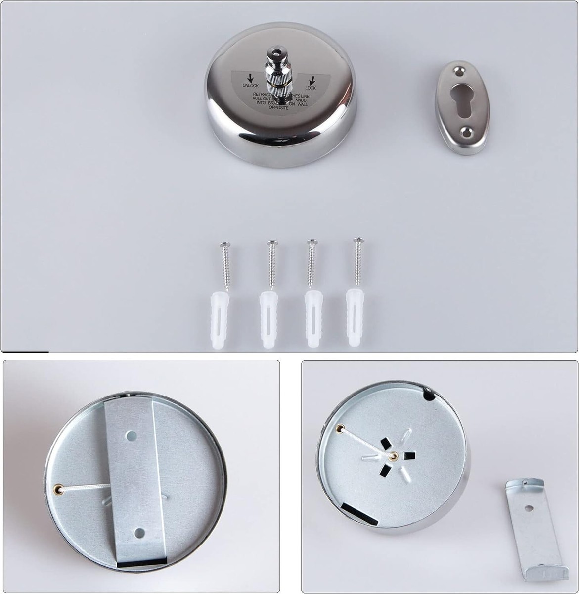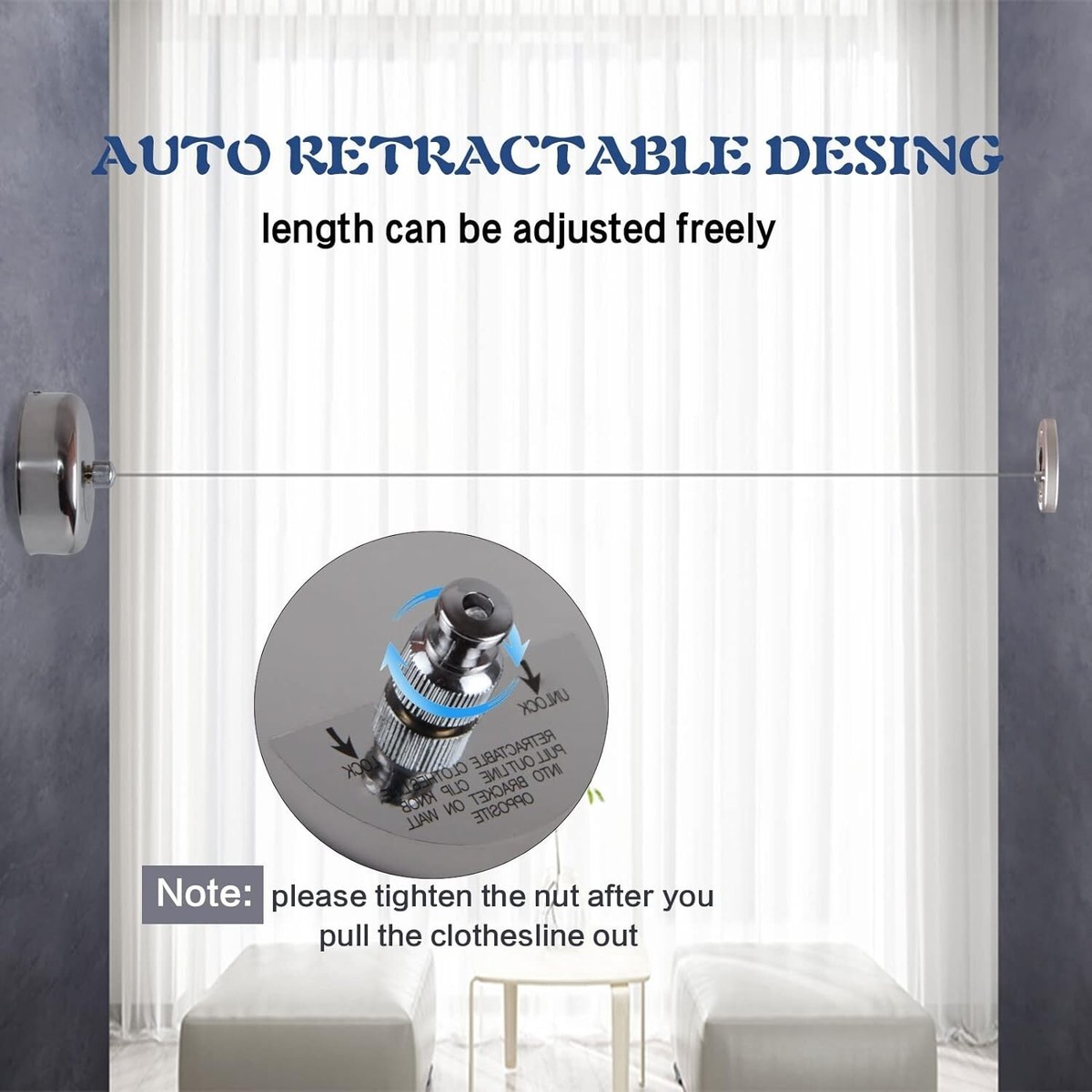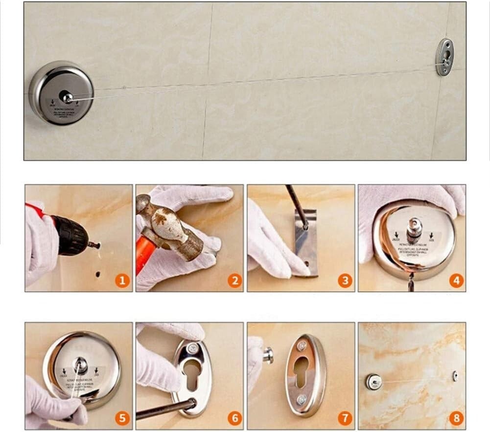 Retractable Clothesline 304 Stainless Steel Retractable Clothesline Retractable:Adjustable Stainless Steel line extends up to up to length under feets is available with Lock Button. Save Space:Very easy to retract if needed to move the line back to its case for easy storage. Widespread Use:Used for hanging wet bathing suits, baby clothes,delicates that can't be machine dried. Great addition to any home, hotel, indoors outdoors, laundry room and boat. Rustproof:Polished Chrome Finish,makes the item rustless and corrosion from daily use .Great gift idea for men, women, mom, home and family, Good choice for Christmas Day and New gift.