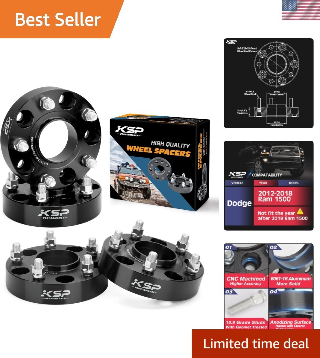 KSP Wheel Spacers for Ram 1500, to Hub Centric Forged Wheel Spacers, Hub Bore Thread Pitch for 2012-2018 D-o-d-g-e Ram 1500, Package of 4Pcs Black