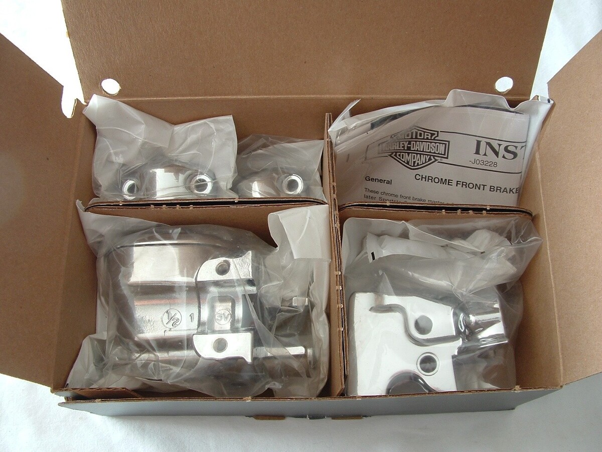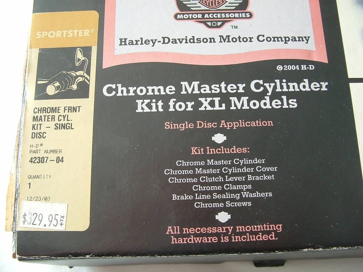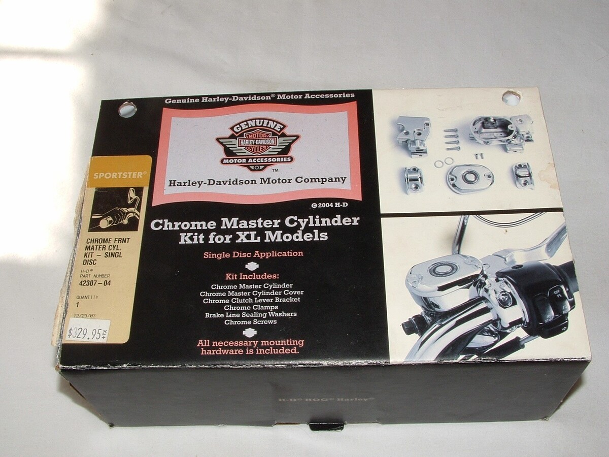Harley Davidson chrome master cylinder kit. Part number 42307-04. This is a FRONT SINGLE disc master cylinder kit. Fits 2004 and up XL Sportster. I do not know how far up in model years this will fit. Consult with your dealer or mechanic to be sure. This is a brand new kit in the factory box. All parts still sealed in factory bags as shown. $9.00 shipping to the lower 48.