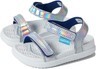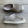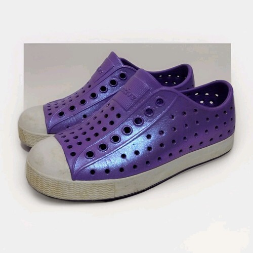Native Jefferson Child Bling Shoe in beautiful iridescent light teal, with white rand and toe and light teal soles. These are in Excellent condition with no stains or damages. Virtually no wear. No loss of sparkle or color!