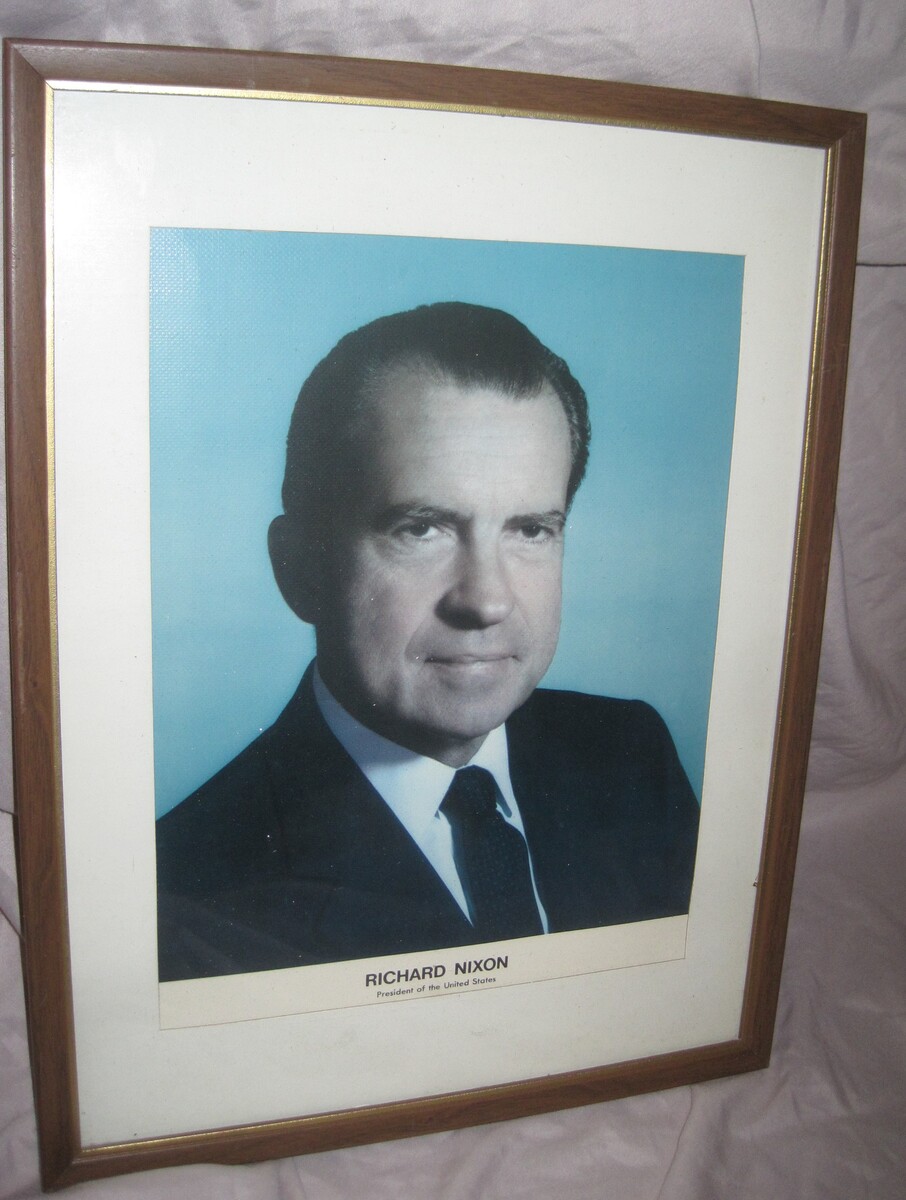 The framed picture of Nixon looks official like something you would see in government buildings in the 70s. Also included in this lot Nixon inauguration License plate souvenir and it comes with the original packaging.