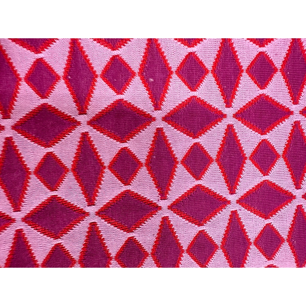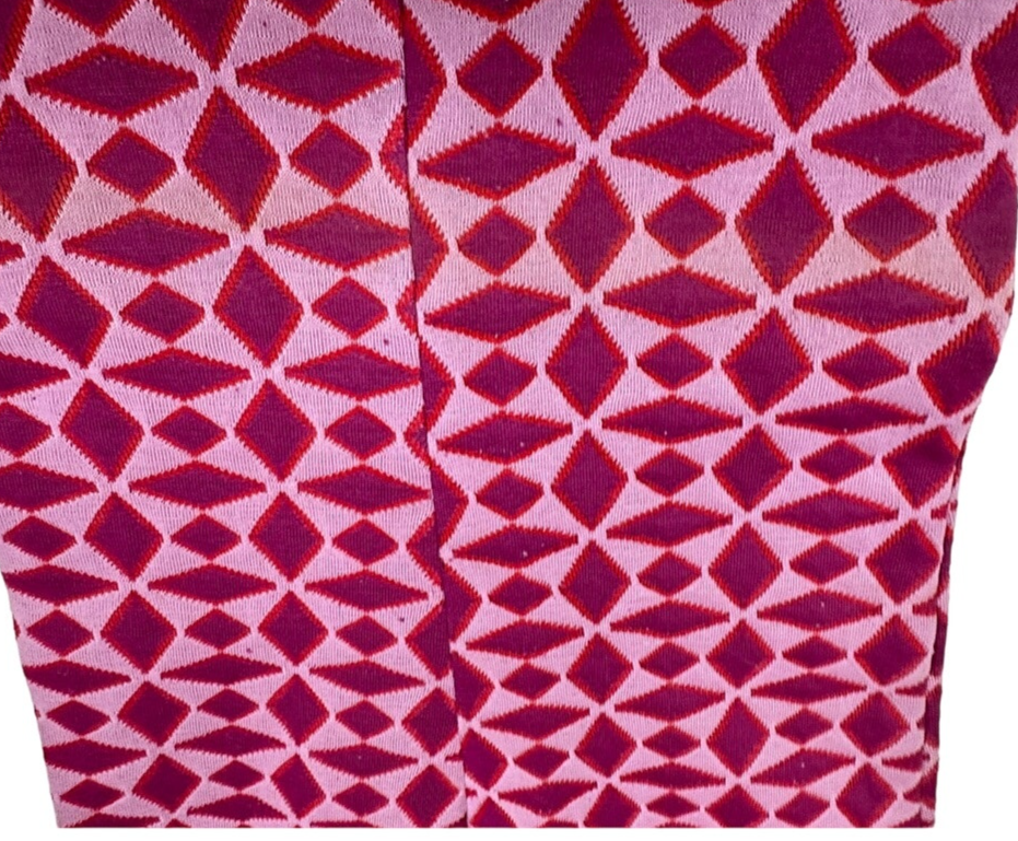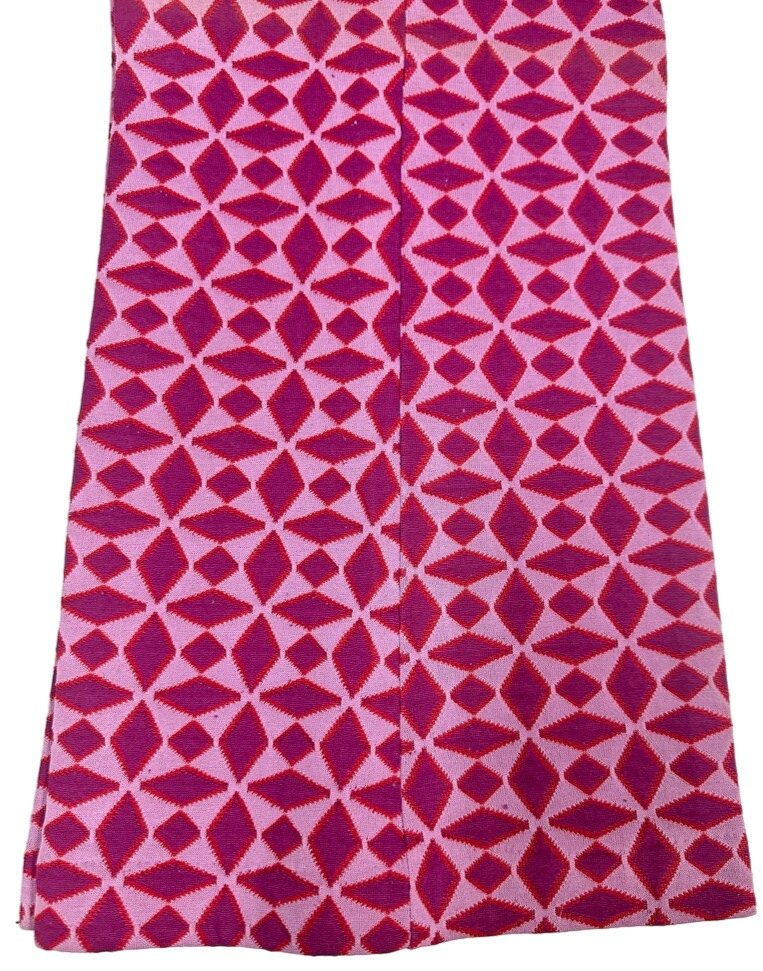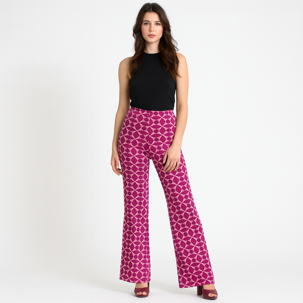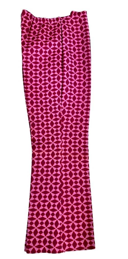 Vintage 1970s polyester bell bottom flare pants in a super mod purple diamond print outlined in red on a lavender ground. Women?s size 14. Pull-on style with elastic waist and light stretch in the fabric. Deadstock ? never worn, still with original tagger attached.