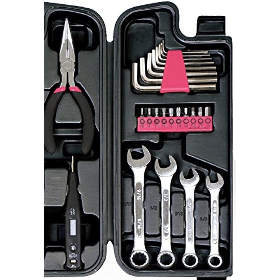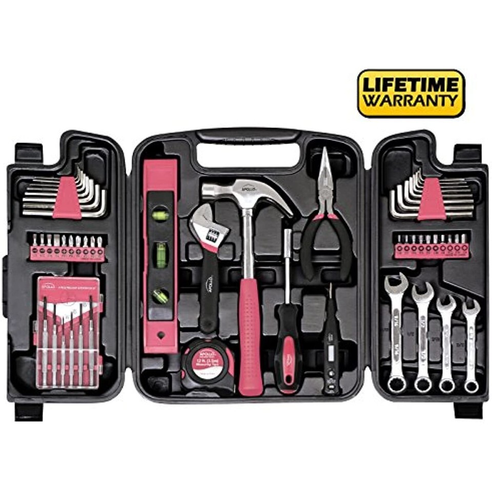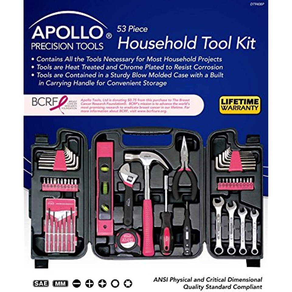 Apollo Tools DT9408P 53 Piece Household Tool Set with Wrenches, Precision Screwdriver Set and Most Reached for Hand Tools in Storage Case Pink Ribbon