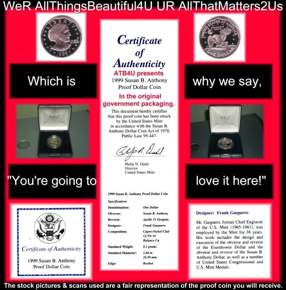 One beautiful 1999-P Proof Susan B Anthony Dollar in OGP with CoA Plus one 1999-D Lightly toned Susan B Anthonl loose dollar coin. Very pretty and that's saying alot for any SBA's