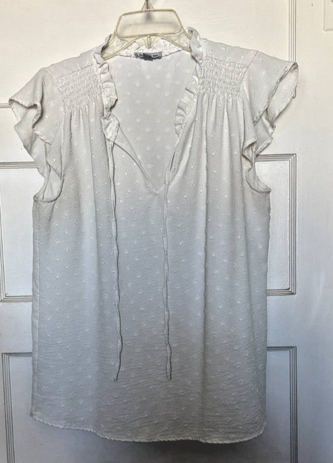 Floral Ivy Chic White Ruffled Blouse for Women Size M. Elevate your style with this chic white blouse featuring elegant ruffles. Perfect for any occasion, this top adds a touch of sophistication to your wardrobe. 100% Polyester and machine washable. Armpit to armpit measures 22?. Shoulder to hem is 25". Good Used Condition - See Photos for further description.