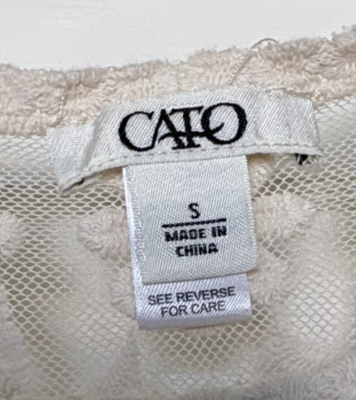 Cato Cream Floral Lace Blouse Size S. Chic lace blouse with floral pattern. Short sleeves. Ideal for versatile styling. 69% Cotton, 31% Nylon. Hand Wash. Armpit to armpit measures 17?. Shoulder to hem is 26.5?. Very Good Used Condition - See photos for further description.
