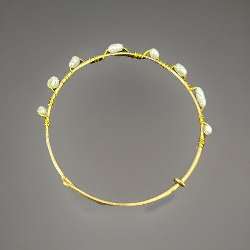 Gold Tone Bangle Bracelet Genuine Wire Wrapped Delicate Pearls