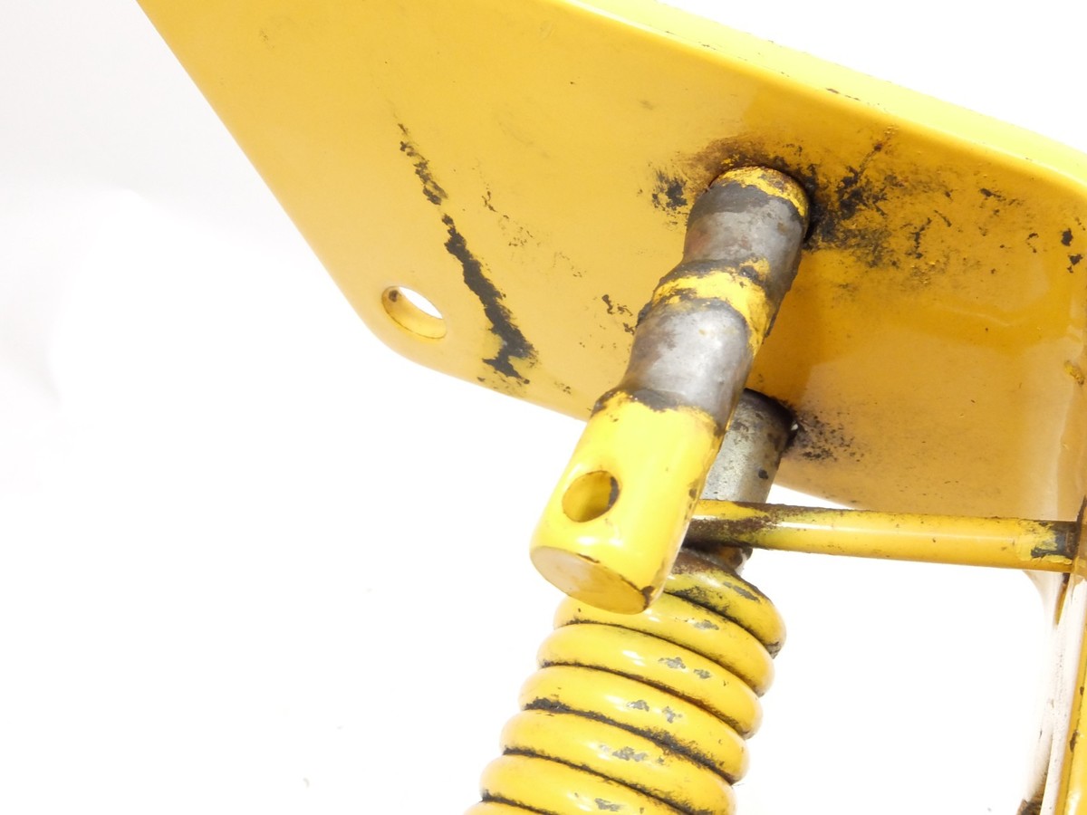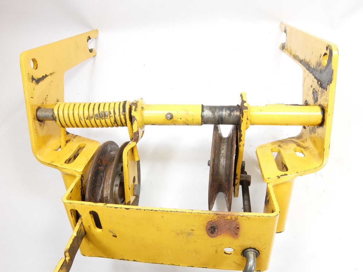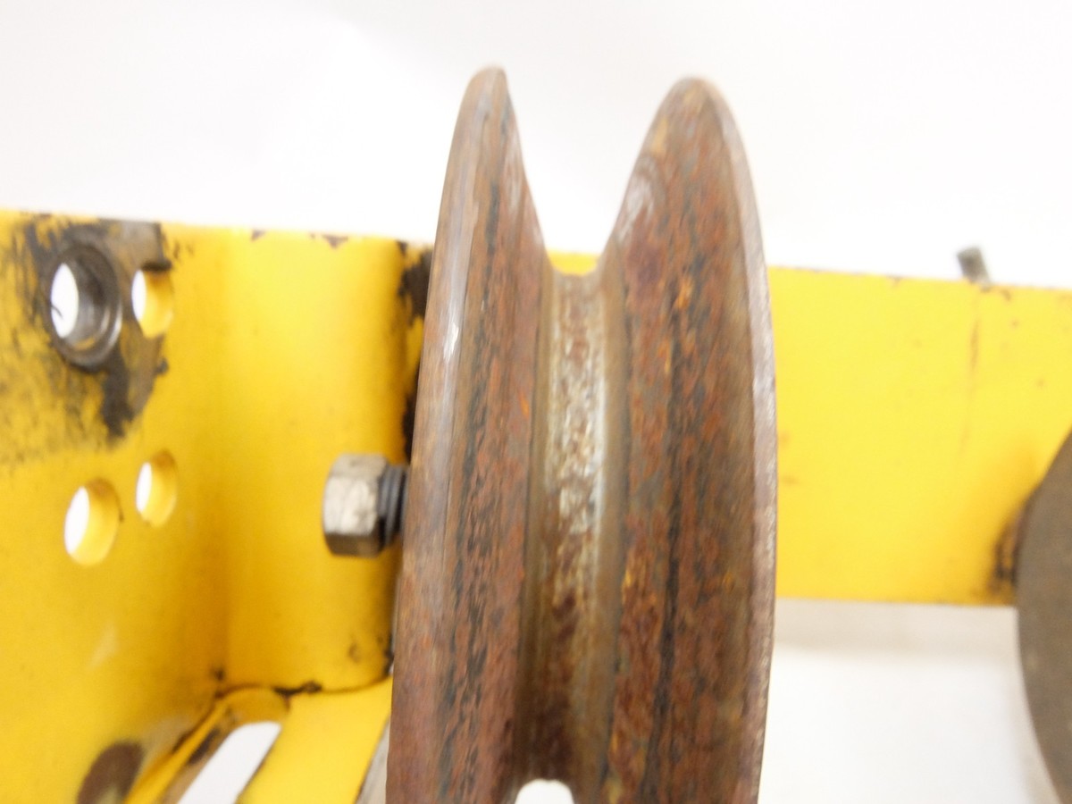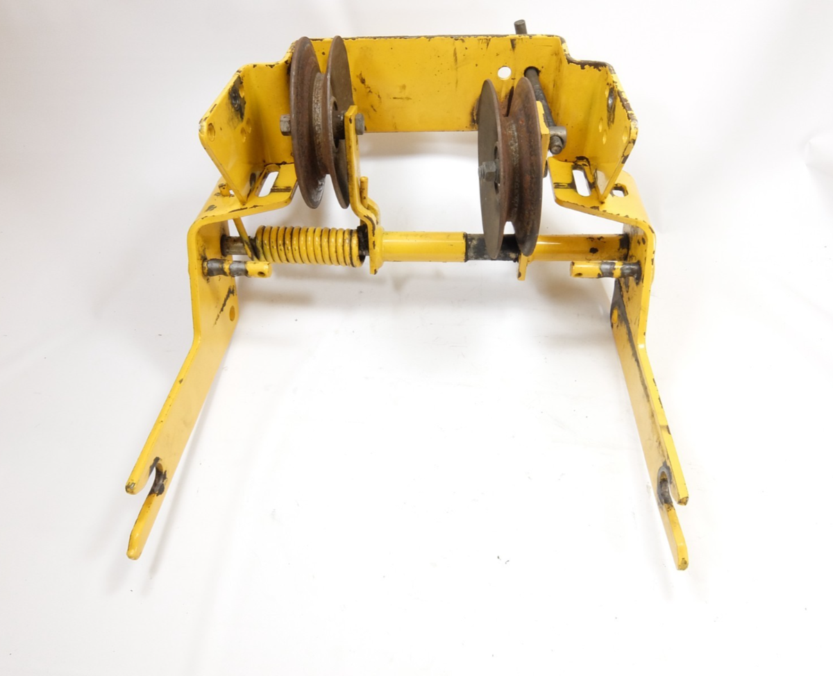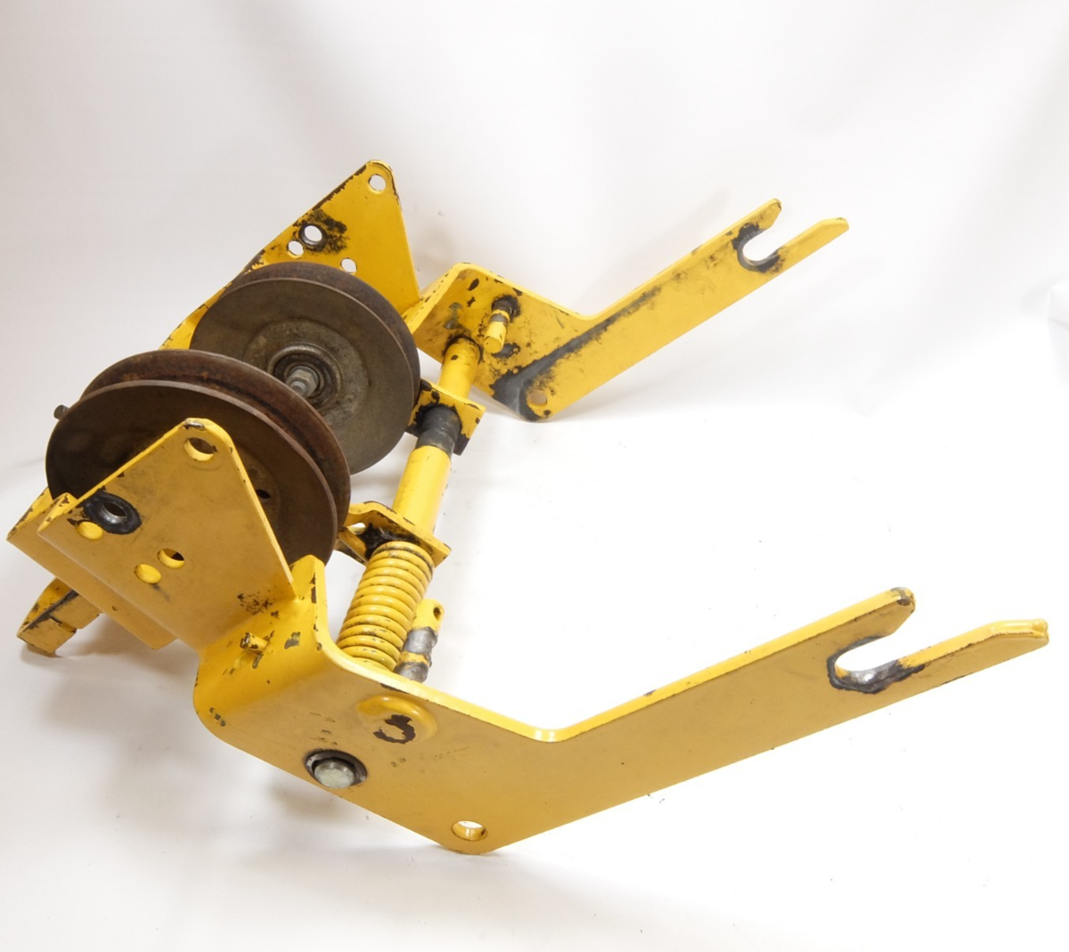This is a used mule drive deck belt tensioner that was removed from the unit listed below. It was functioning well before the tractor was disassembled. The pulley idler arms pivot freely. The pulleys themselves spin quietly, but the pulley bearings seem to have dried grease in them. Note that the welded pins show some wear. The torsion spring seems fine.