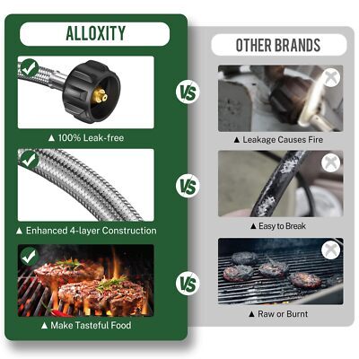 Long-lasting Hose Construction for Safer Connection ? Updated stainless steel braiding protects the propane tank hose from rodents? chewing. The propane hose consists of weather-resistant PVC, highly tensile cotton braiding, anti-corrosion PVC tube and stainless steel braiding. With a sturdy and flexible 4-layer structure, the propane adapter is strong enough to withstand harsh outdoor environments, ensuring durability.