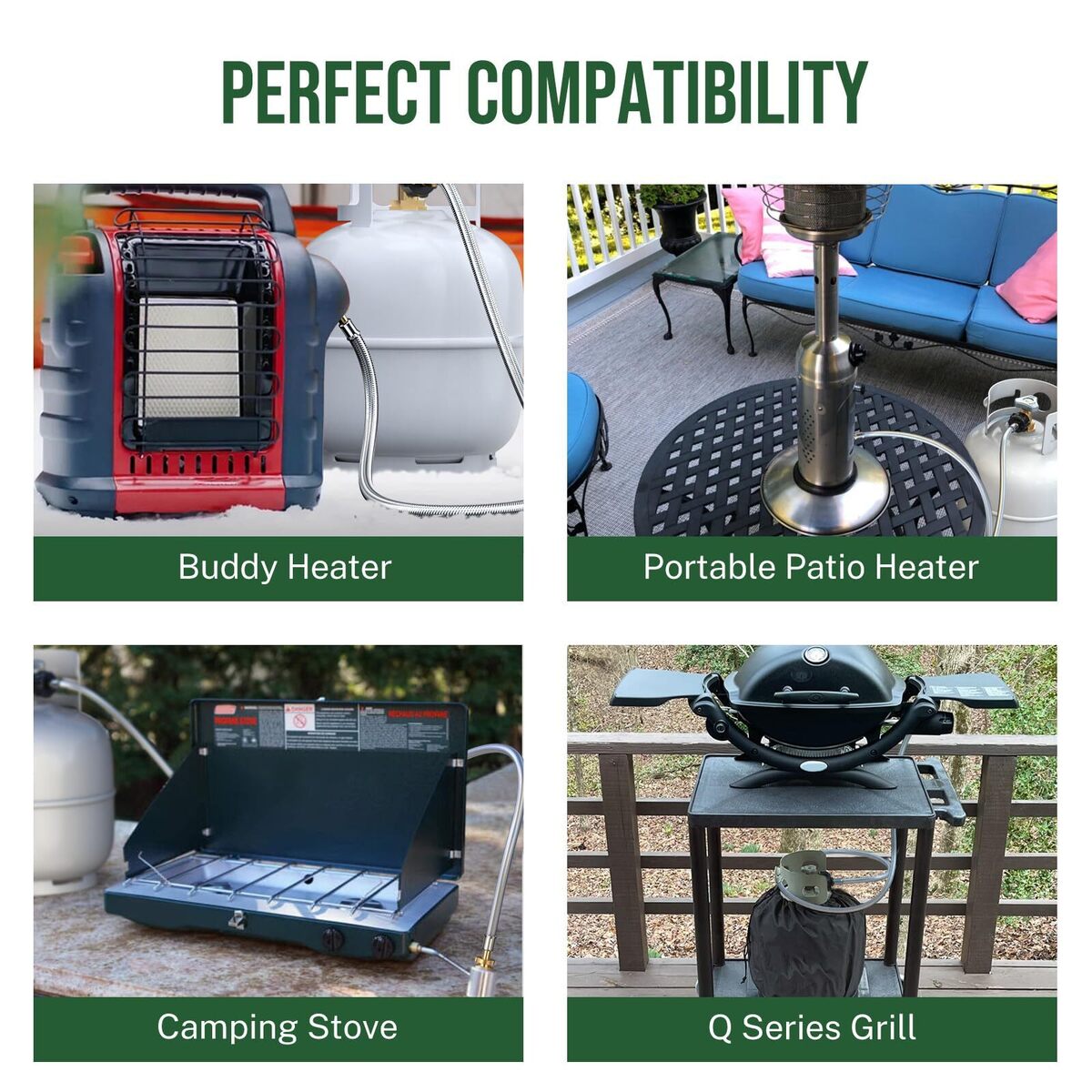 Known for Compatibility ? The propane hose adapter is specifically designed to fit perfectly for Weber Q grills, Coleman camping stoves, Blackstone 17" 22" griddles (regulator needed) and Buddy heaters. Moreover, this propane adapter hose can easily connect most 1lb. LP outdoor appliances to 5-40lb propane tanks, making it an ideal choice for camping, tailgating, heating or outdoor grilling.