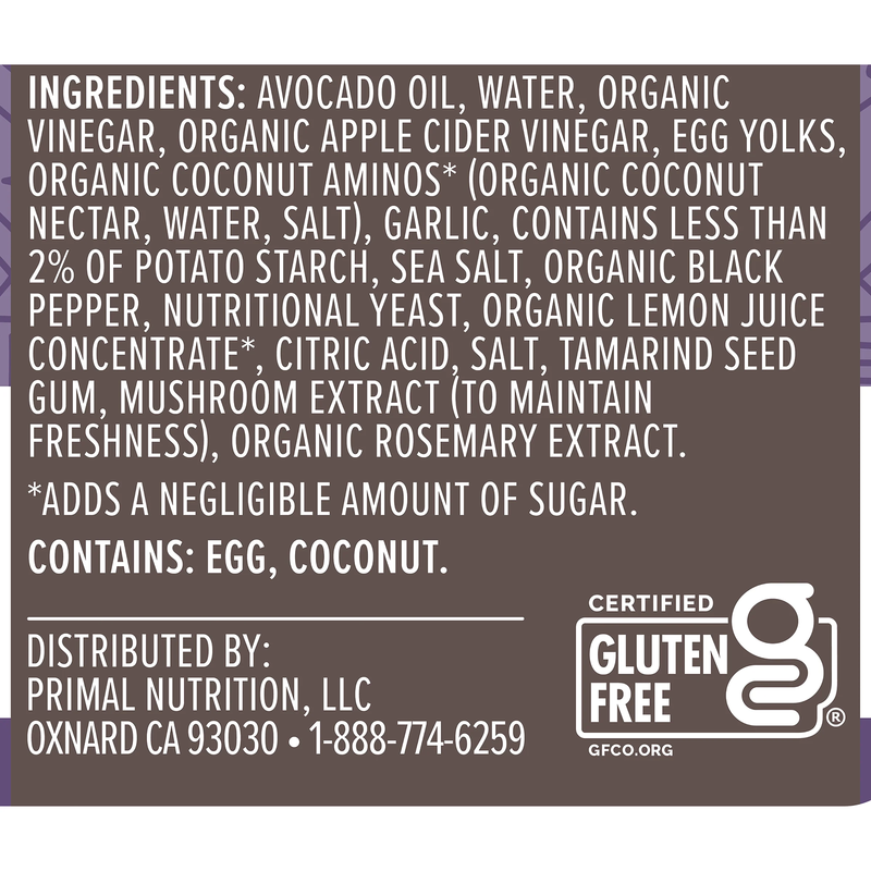 Avocado Oil, Water, Organic Coconut Aminos (Organic Coconut Sap, Sea Salt), Organic Apple Cider Vinegar, Organic Gum Acacia, Organic Guar Gum, Organic Distilled Vinegar, Organic Roasted Garlic, Sea Salt, Organic Black Pepper, Organic Eggs, Nutritional Yeast, Organic Lemon Juice Concentrate, Organic Garlic Powder, Organic Rosemary Extract./div