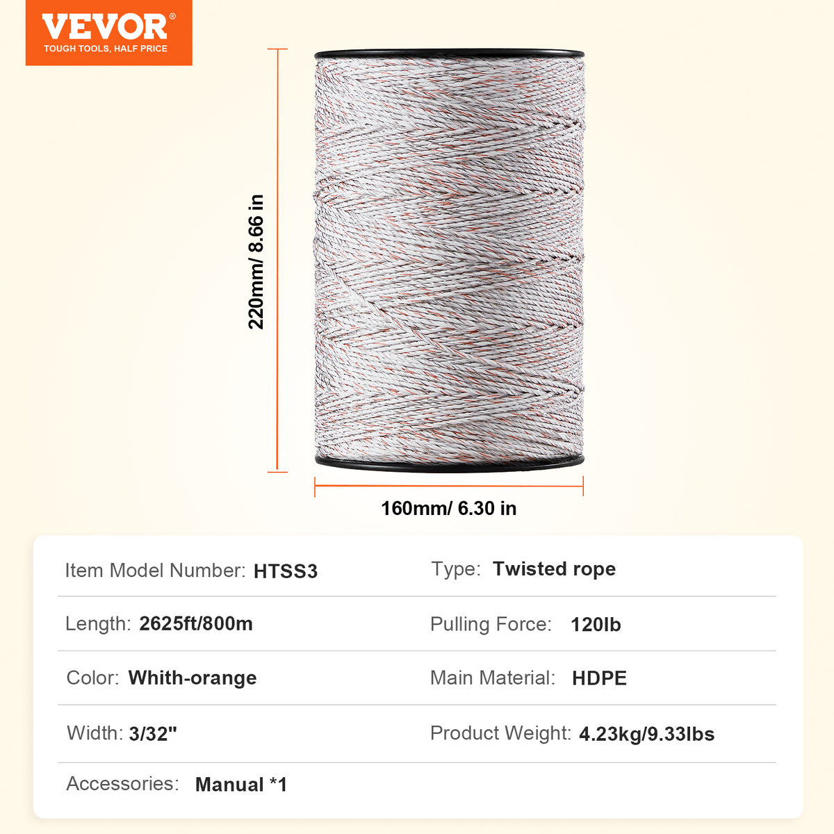 VEVOR Electric Fence Wire, 2625Ft 800M Portable Polywire, 3/32" Diameter