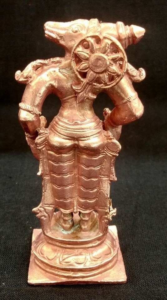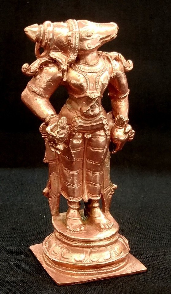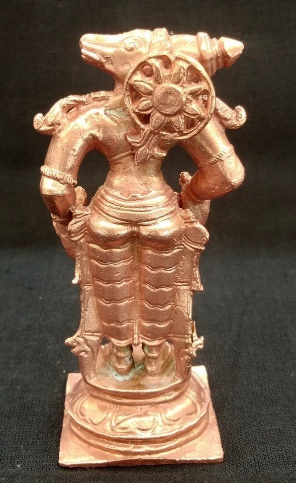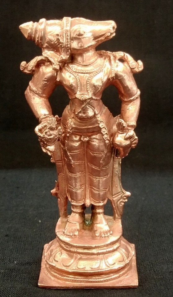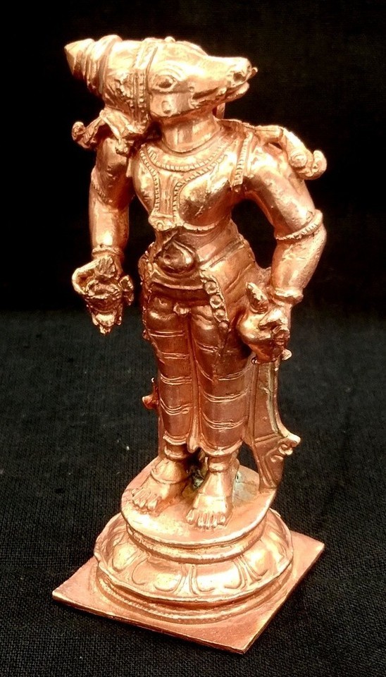 Design : A beautiful sculpture of the avatar of Vishnu, Lord Varaha crafted in heavy copper by artisans of south india . Lord Varaha holds a shankha and chakra on his hands , Varaha?s silhouette is magnificent! His face is equally as beautiful from the back as from the front. In his hand is a conch shell, which represents ?Om?, the first sound of creation and also the beginning of matter, since sound and matter are consider to be synonymous.