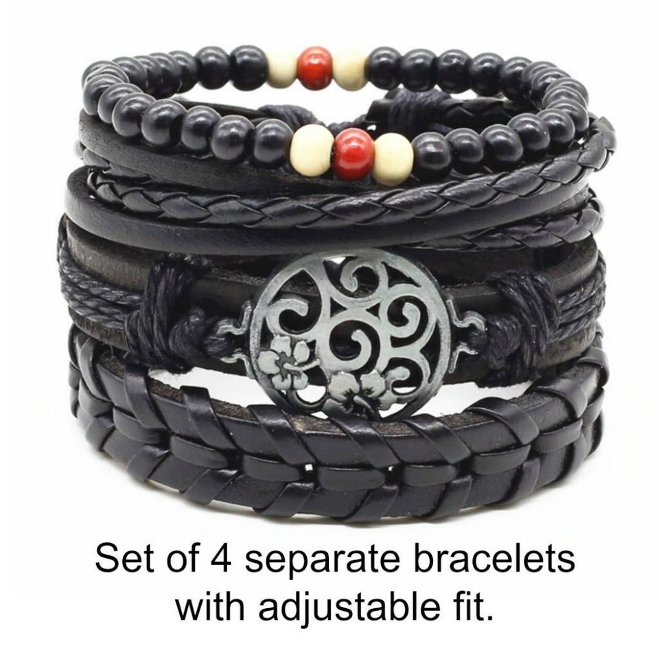 SET OF 4 BRACELETS 4pcs Braclet Black Wood Bead Leather Braided Adjustable Cord