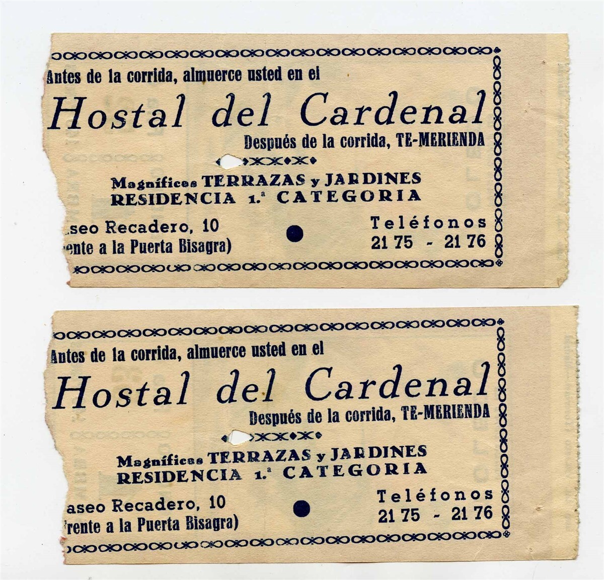 A used pair of colorful Plaza Toros de Toledo Bull Fight Tickets. from Toledo Spain in 1950's. HAs advertising from the Hostal Del Cardenal on the backs.