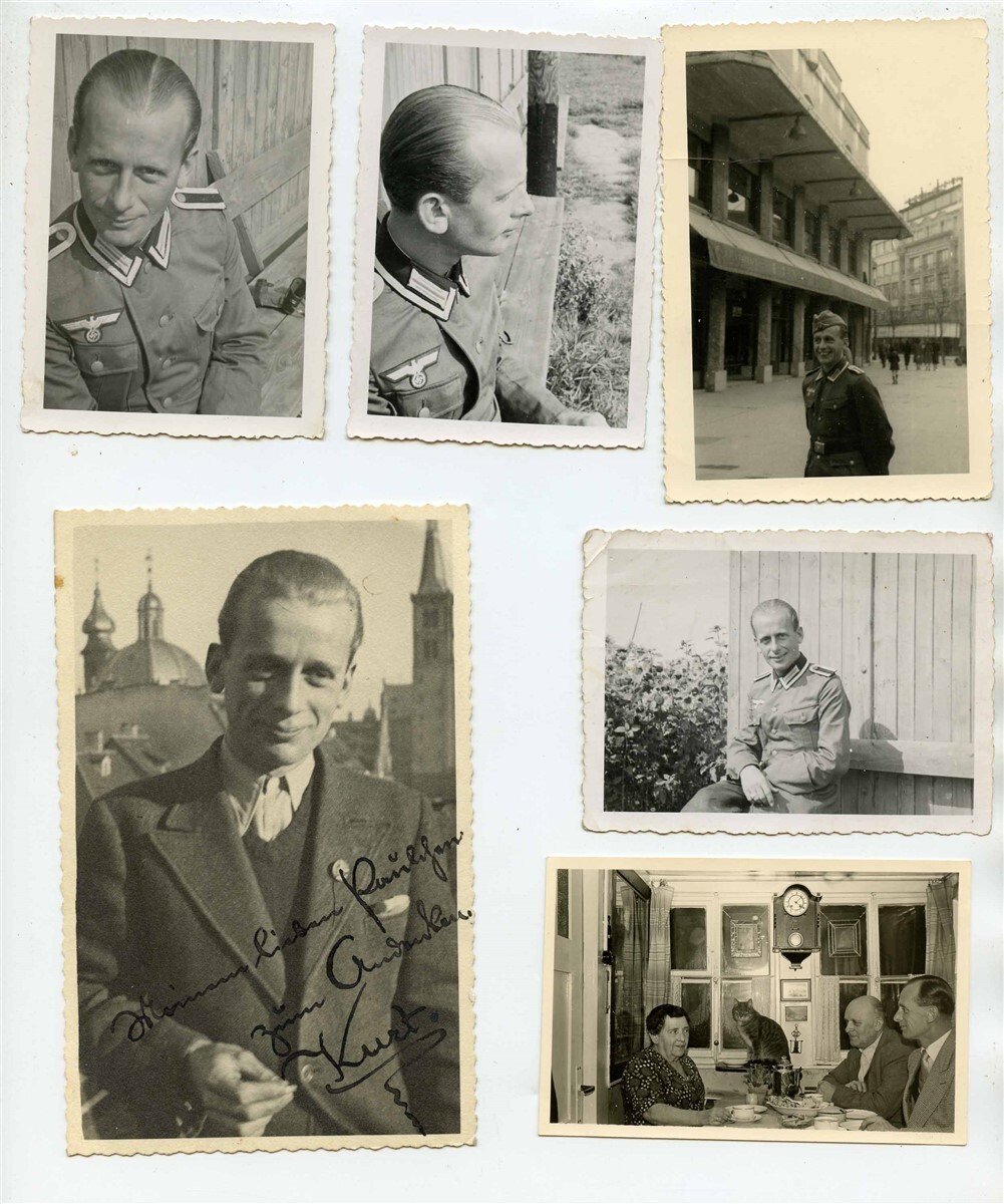 8 original vintage black and white photographs and a signed real photo postcard of a German Soldier in Uniform and in Mufti. Several are dated 1932 and 1936 and those in uniform are dated 1943. Most measures 3 1/2" x 4 1/2"