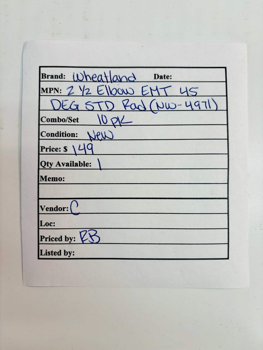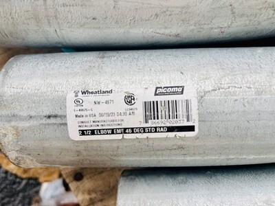 10 Pk Wheatland 2-1/2 Inch EMT Elbow 45 DEG Std Rad (NW-4971) New Local Pick Up The 2-1/2 inch EMT conduit 45 elbow is a standard radius fitting designed to change the direction of EMT conduit runs by 45 degrees. It is made of steel with a galvanized finish for strength and corrosion resistance, helping protect the conduit system in commercial and industrial electrical installations. The fitting has a smooth interior that supports easier wire pulling and meets industry standards such as UL 797 and ANSI C80.3 for EMT conduit fittings. Its 10.5-inch bend radius and 2-1/2-inch trade size ensure proper alignment and continuity of the raceway. This elbow is suitable for use wherever a directional change in EMT conduit is needed without compromising structural integrity or electrical performance. Listed by: Renee (Sales Team) ?Life is often made up of trying things...just to see if they will work? RRW (A positive moment brought to you by Help Resale) About Us Welcome to Help Resale, your go-to consignment shop where value meets quality. At Help Resale, we're dedicated to providing you with an exceptional shopping experience, whether you're looking to find the best deals or consign your items. Need to buy a product, but don't see it in our store? Please feel free to reach out to us and we will help you find it! Help Resale 7200 Fair Oaks Blvd Suite 120 Carmichael CA 95608 Business Hours: Monday-Friday: 9:00 am to 5:00 pm (PST) All product and company names are trademarks TM or registered trademarks of their respective holders. Use of them does not imply any affiliation with or endorsement by them.