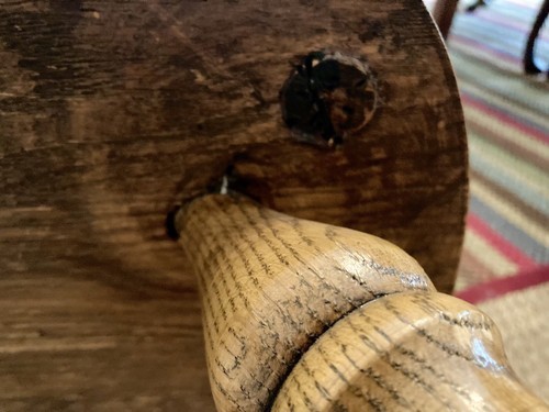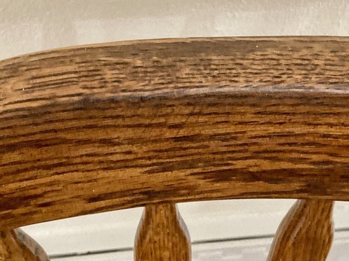 In the Windsor style, the heavy oak chairs have turned splay legs and back spindles.