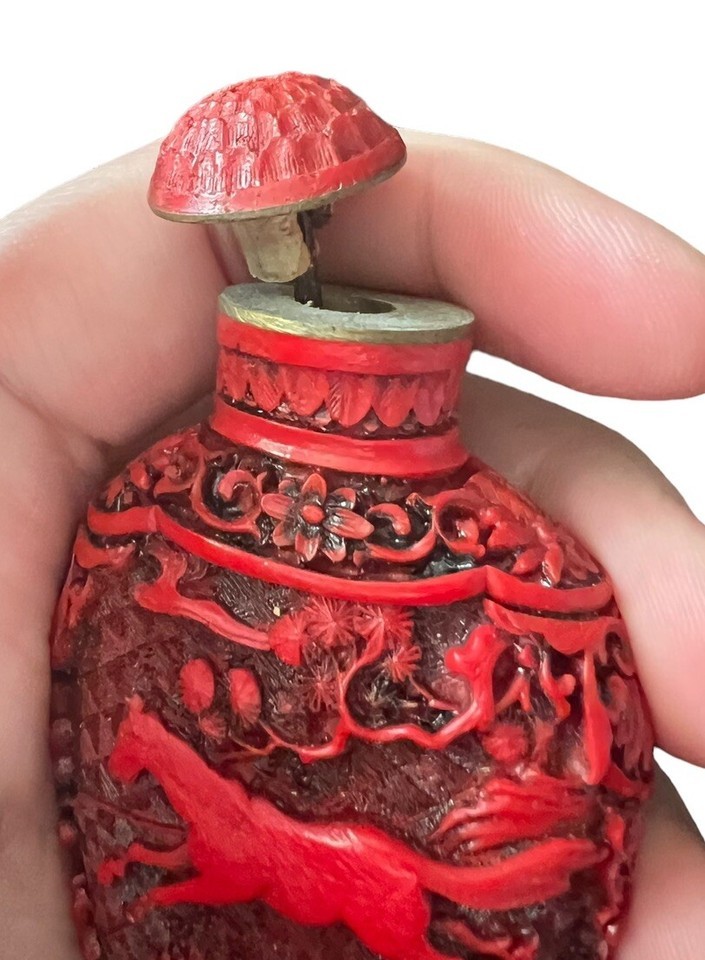 Antique Chinese Red Cinnabar Snuff Bottle Hand Carved Horse Floral Marked