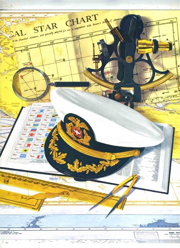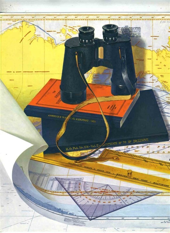 A Dinner menu for December 2, 1972 at sea en route to Yokohama, Japan. The menu is in mint condition. The cover is by Artist Don Crowley. It features a sextant, Captains Cap with books, maps and nautical Instruments. It measures about 11" x 17 1/2" when open. In mint condition. THIS IS A MENU