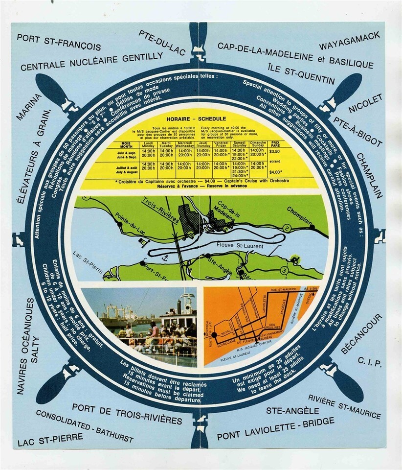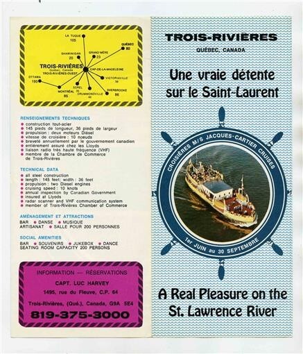 A full color 4 panel brochure in French and English. M/S Jacques Cartier Cruises Brochure / On the St Lawrence River from Trois Rivieres. Has maps, cruise information, color phtos and more.