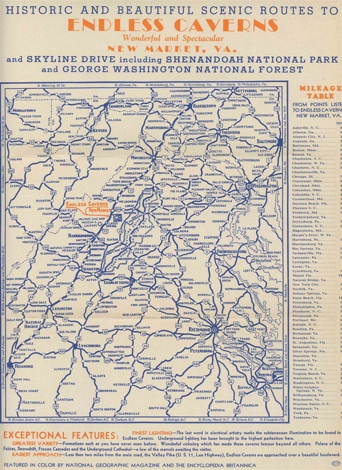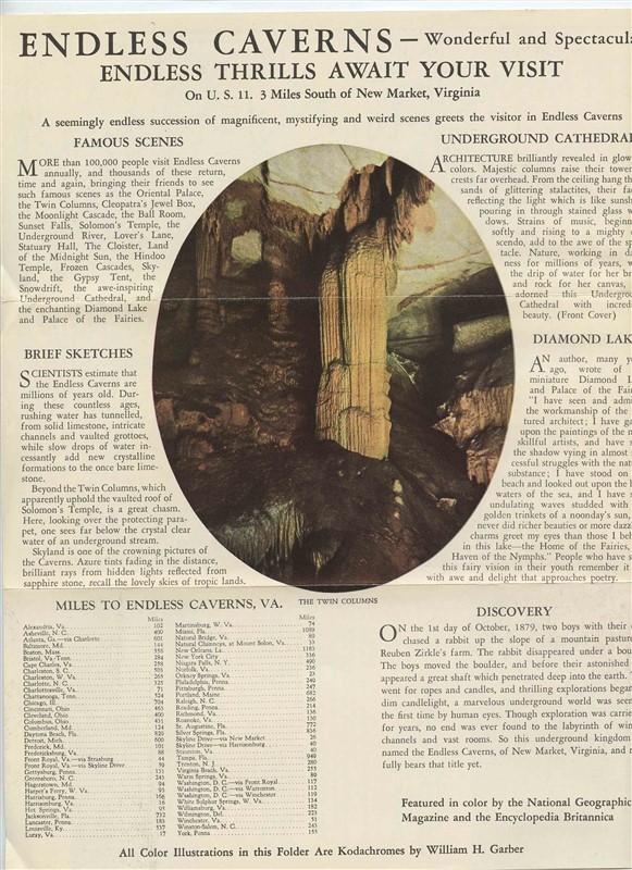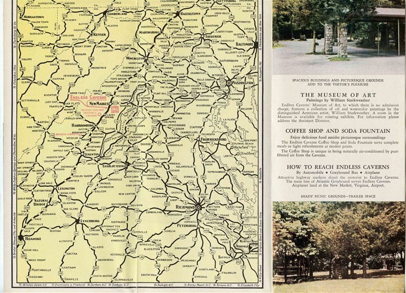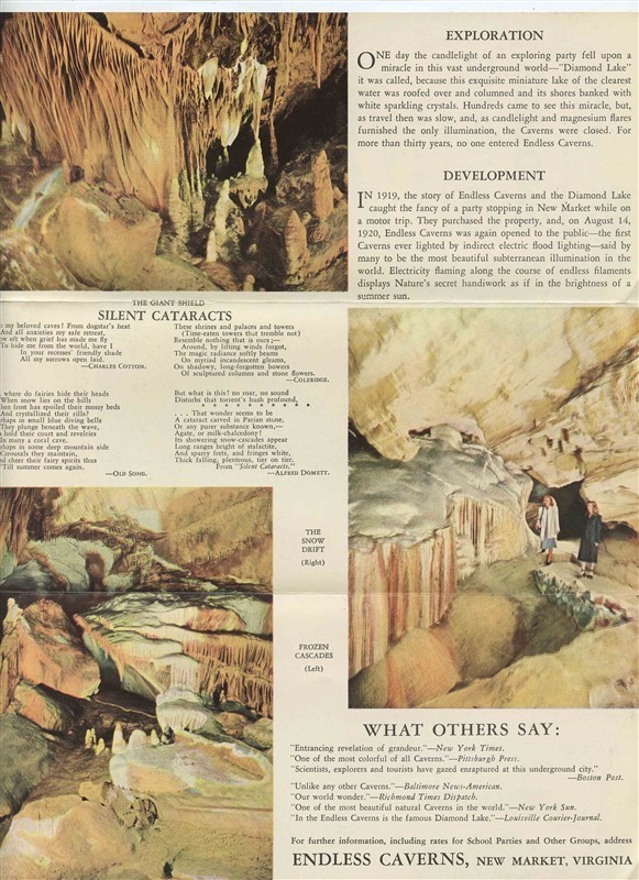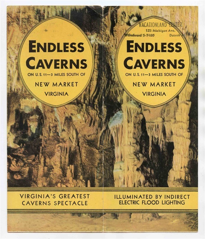 And A 6 panel fold out brochure with map in very good condition. An Endless Caverns Brochure and Route Map of historic and scenic routes to Endless Caverns in New Market Virginia.In the Heart of nbsp;the Shenandoah Valley and a 3 minute drive off US 11, Lee Highway, via Skyline Drive. With photos and information on the Endless Caverns and area. nbsp;With large area map, mileage table and mor