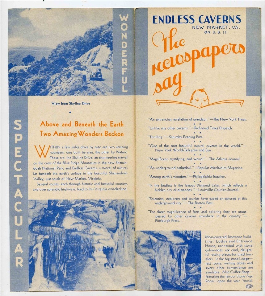 2 different Endless Caverns Brochures. One from the 1930's and the other from the 1940's. A 12 panel fold out brochure with map in very good condition. With color Kodachrome photos. An Endless Caverns Brochure and Route Map of historic and scenic routes to Endless Caverns in New Market Virginia.In the Heart of the Shenandoah Valley and on US 11, Lee Highway, 3 miles South of New Market Virginia via Skyline Drive. With photos and information on the Endless Caverns and area. With large area map, detAiled information and much more.