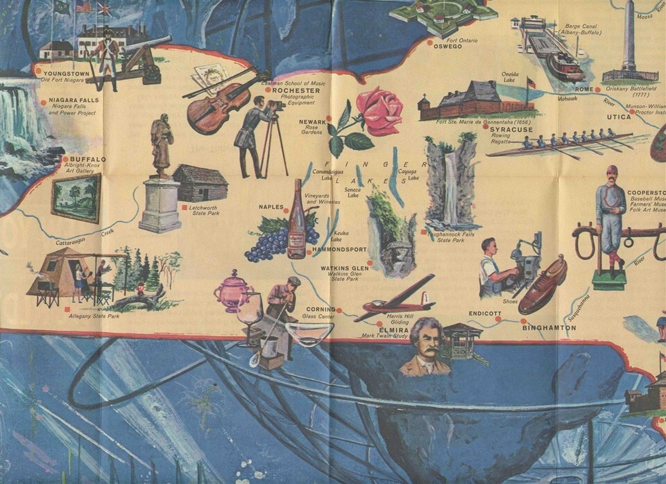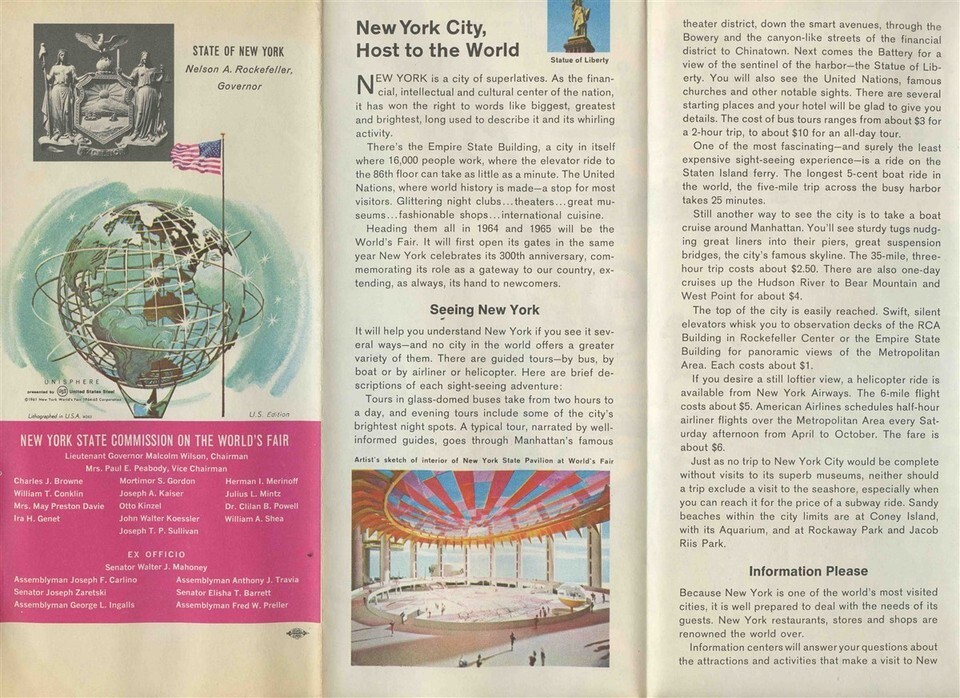 A wonderful 20 panel fold out brochure with photos and detailed information on one side and a large color pictorial map on the other side. 1964 The People of New York State Welcomes You to the World's Fair Brochure
