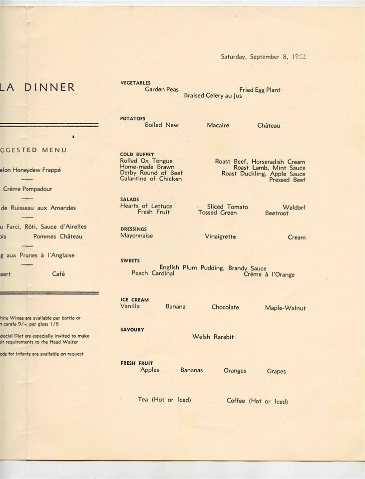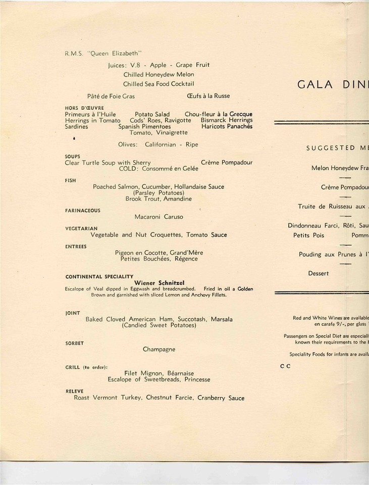Cunard Gala Dinner Menu R M S Queen Elizabeth 1952